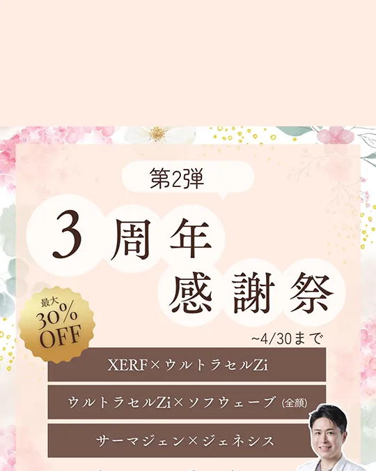 ソフウェーブは真皮中層(深さ約1.5mm)にアプローチするため、脂肪層には届きません。顔のボリュームを落とさずに皮膚表面を引き締められるので、頬コケが起きにくいのが最大の特徴です。HIFUで頬コケを経験された方にこそ向いている施術です。
